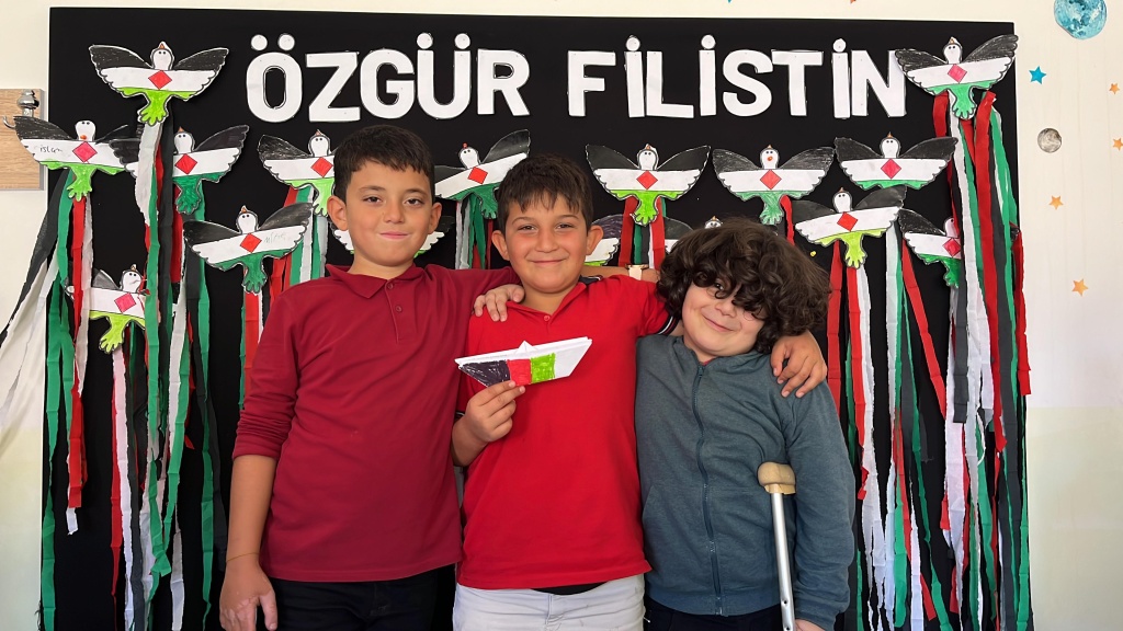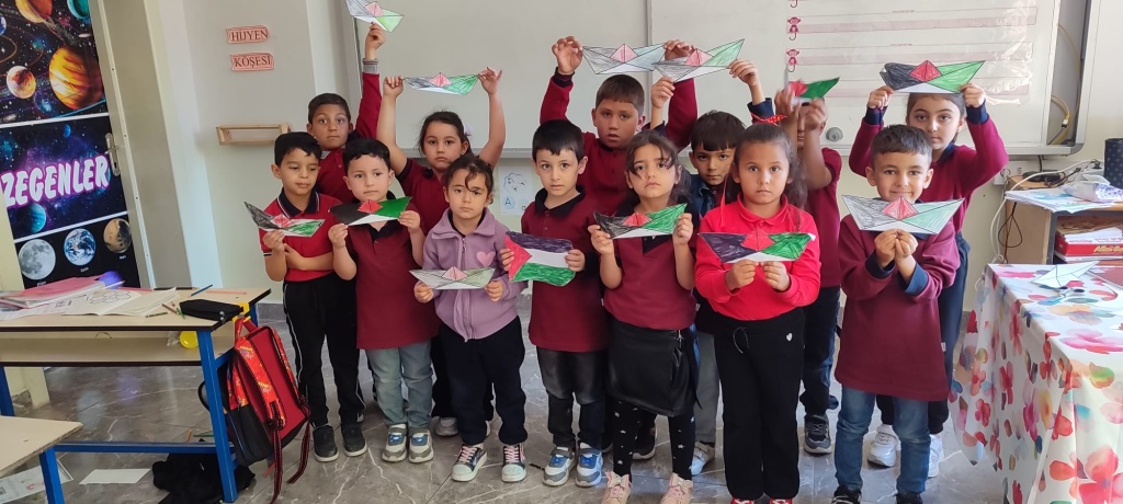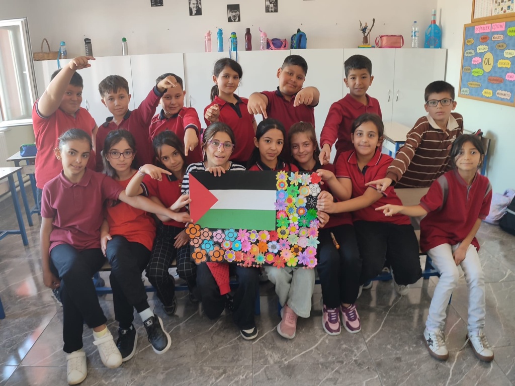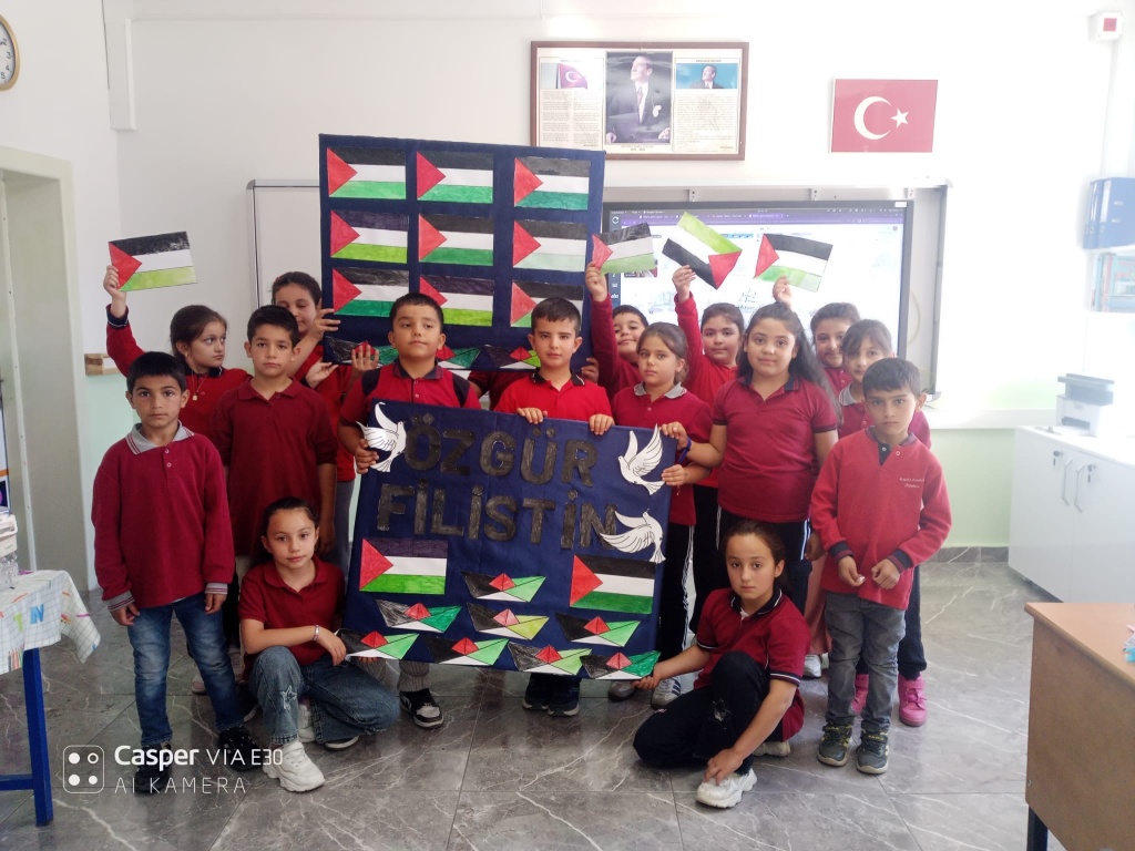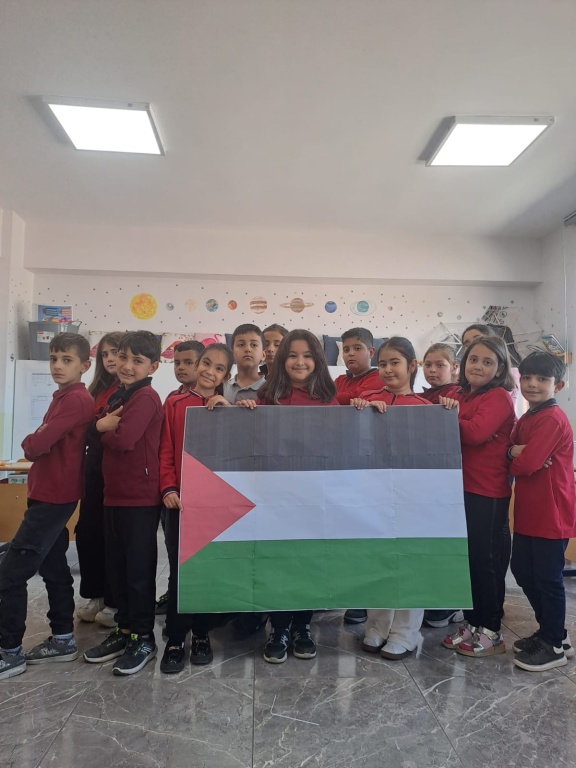 Bugün okulumuzda, Filistinli din kardeşlerimizin maruz kaldığı zulme dikkat çekmek ve onlara destek olmak amacıyla bir farkındalık etkinliği gerçekleştirdik.
