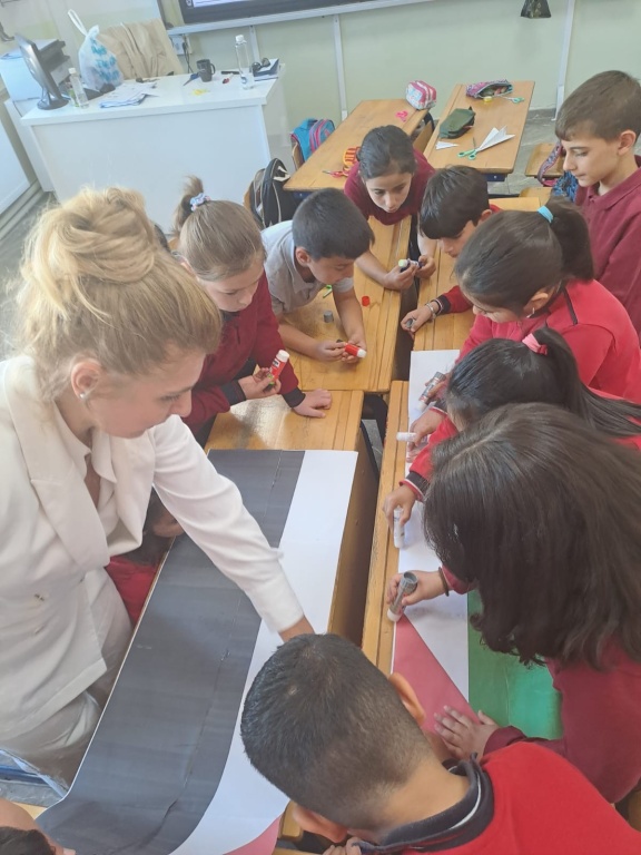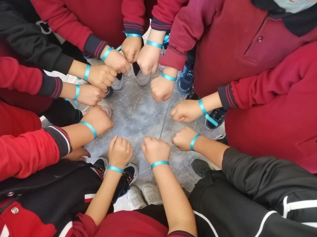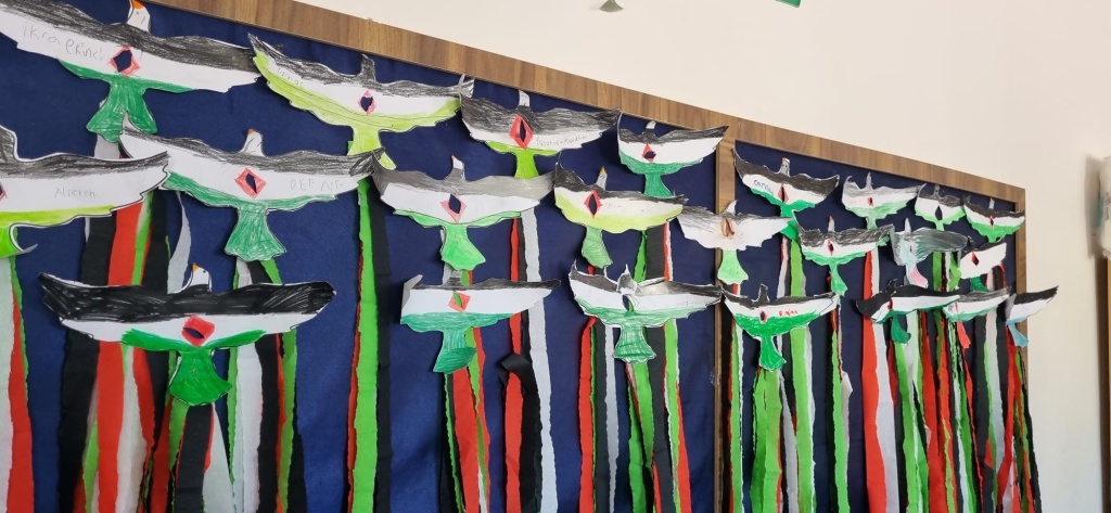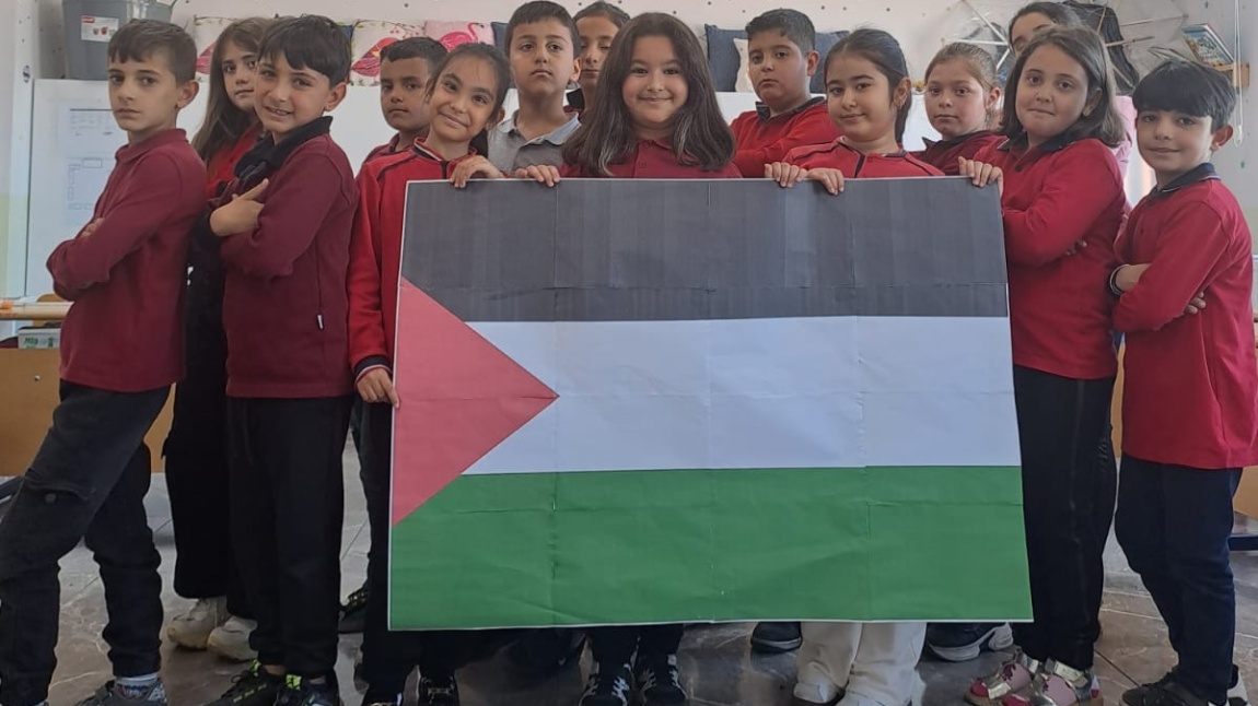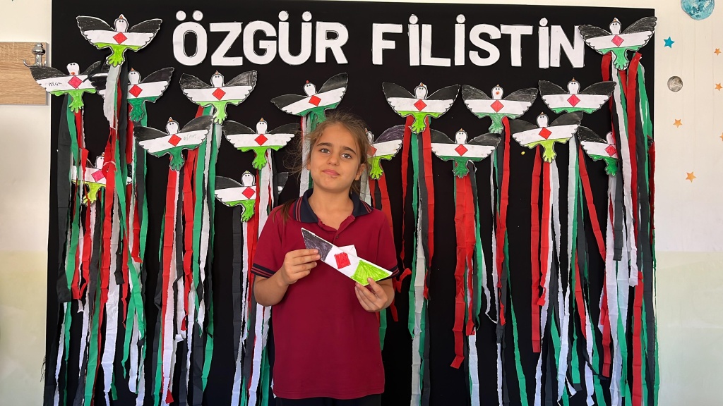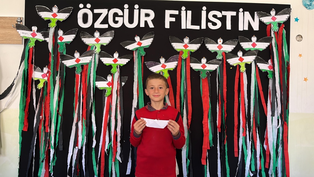 Bugün okulumuzda, Filistinli din kardeşlerimizin maruz kaldığı zulme dikkat çekmek ve onlara destek olmak amacıyla bir farkındalık etkinliği gerçekleştirdik.